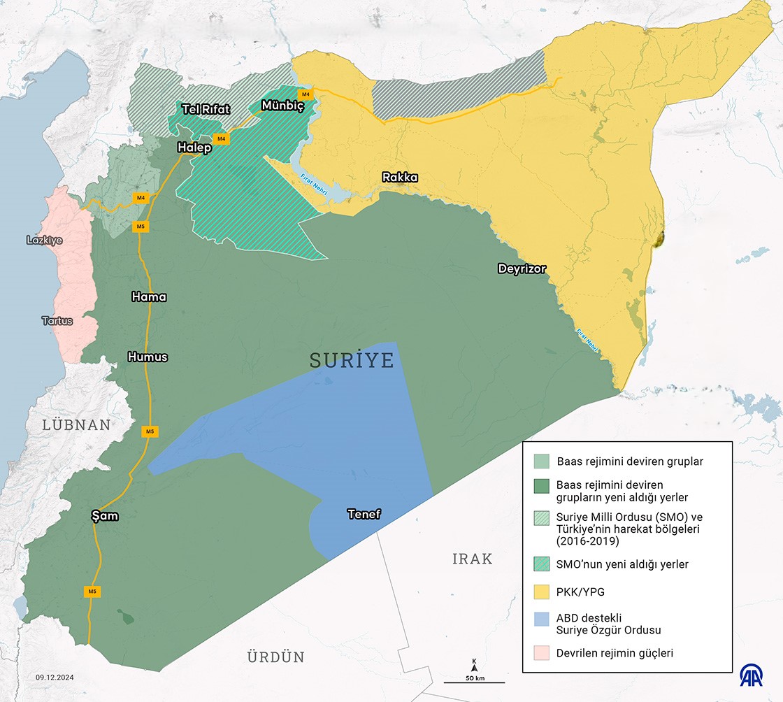 Ayrıca, terör örgütü YPG/PKK destekli SDG ve Türkiye destekli Suriye Milli Ordusu (SMO) birlikleri arasındaki çatışmalar devam etmektedir. Aralık 2024'te, SMO ile SDG arasında Münbiç ve Tel Rıfat bölgelerinde şiddetli çatışmalar yaşanmış ve bu çatışmalar sonucunda SMO, Münbiç’i SDG'den almayı başarmıştır.