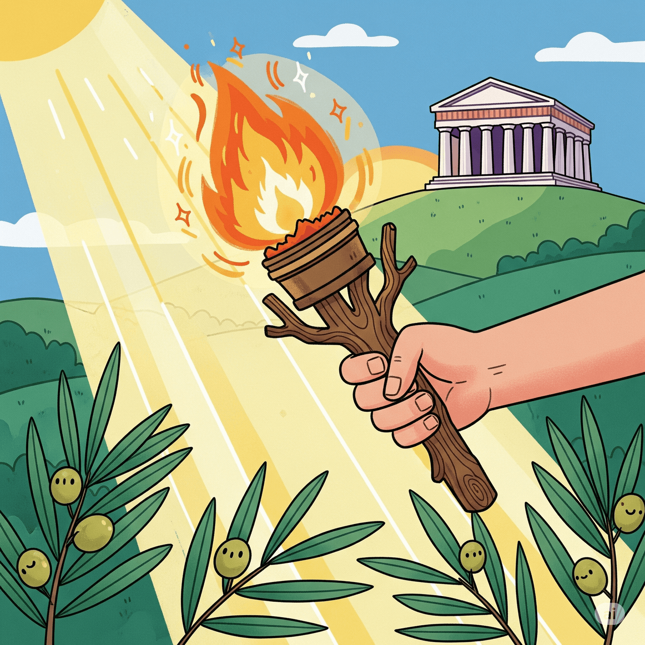 In the temple at Olympia, a perpetual flame burned without ever being extinguished. This flame symbolized peace. During the games, even wars were halted! The modern Olympic flame derives from this tradition. The torch is lit before the games begin and carried to the host city.
