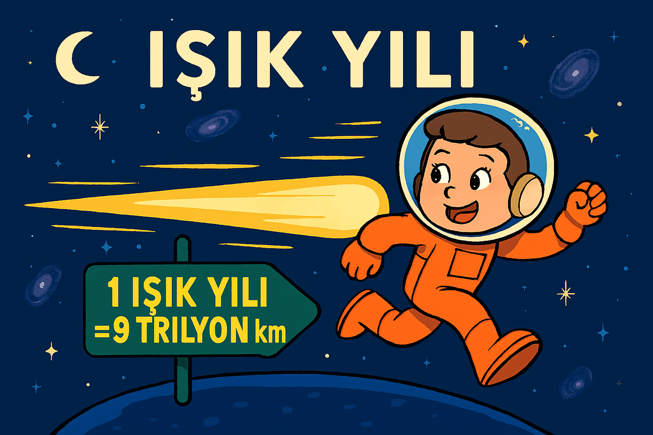 Light is the fastest thing in the universe, traveling through vacuum at exactly 300,000 kilometers per second. This is millions of times faster than the speed of a car or an airplane! A light-year is the distance that light travels in one year. There are 365 days in a year, right? When we calculate this, one light-year equals approximately 9 trillion kilometers. That means we place twelve zeros after the number nine: 9,000,000,000,000 km!