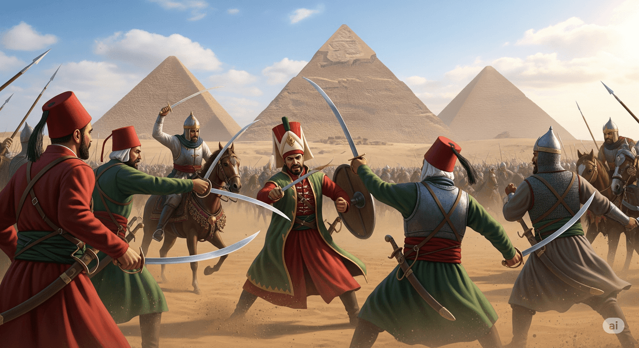 After weeks of grueling travel, the army crossed the desert, weary but determined, and arrived before Cairo. The new Mamluk Sultan, Tumanbay, had prepared his forces at a place called Ridaniya, digging trenches to protect his cannons and positioning them firmly in place to counter Ottoman artillery. Seeing this preparation, Yavuz Sultan Selim demonstrated a brilliant example of military genius. Instead of launching a frontal assault, he ordered his army to circle around Mount El-Mukattam during the night and flank the Mamluk forces from behind. At dawn, the Mamluks found the Ottoman army approaching from an unexpected direction—directly behind their cannons. Unable to reorient their fixed artillery, they were overwhelmed. Thanks to this masterful maneuver, the Battle of Ridaniya ended in a decisive Ottoman victory.