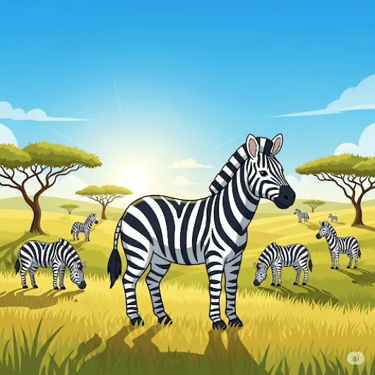Have you ever seen an animal that resembles a horse and has black and white stripes on its body? That animal is called a zebra! Zebras are strong and fast animals, just like horses, and they live across the vast lands of Africa.