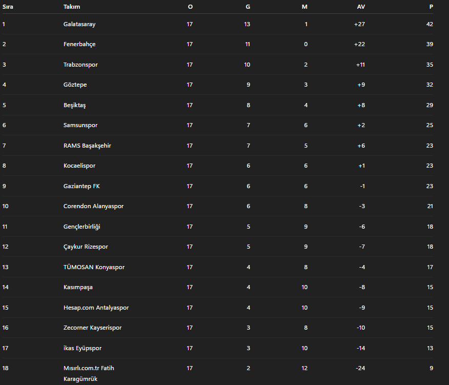 Matchweek 17 of the 2025-26 season concluded on the final day with two matches, bringing the first half to an end. On this closing day, RAMS Başakşehir secured a decisive victory against Gaziantep FK, while the high-scoring encounter between Gençlerbirliği and Trabzonspor contributed to the completion of the week. At the start of the winter break, the league leadership had taken shape between Galatasaray and Fenerbahçe, with a three-point gap separating the two sides at the end of the first half.
