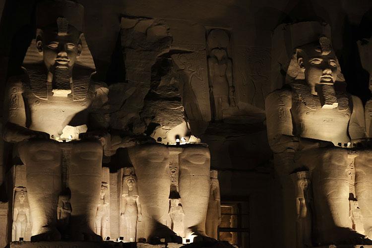 The temple’s axis is aligned so that sunlight penetrates to the innermost sanctuary twice a year, on 22 February and 22 October. Observations conducted in 1966 after relocation confirmed that the statues of Amun, Ra-Horakhty and Ramses II were illuminated, while the statue of Ptah remained in shadow.
