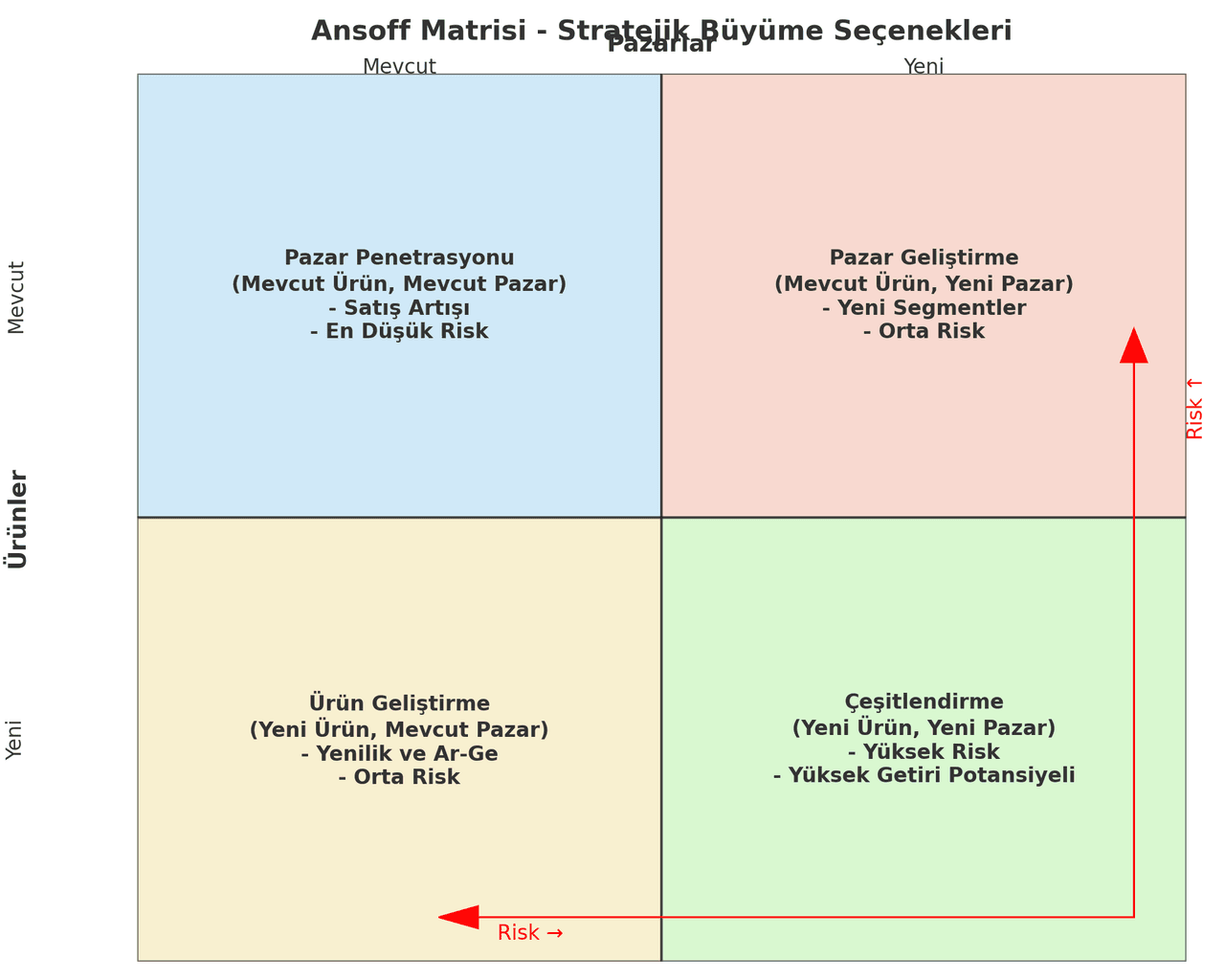 The risk levels, visually emphasized by colors in the diagram, increase toward the upper right corner of the matrix. Market penetration carries the lowest risk, while diversification carries the highest. In this way, the Ansoff Matrix helps organizations understand the risk-return balance when making growth decisions.