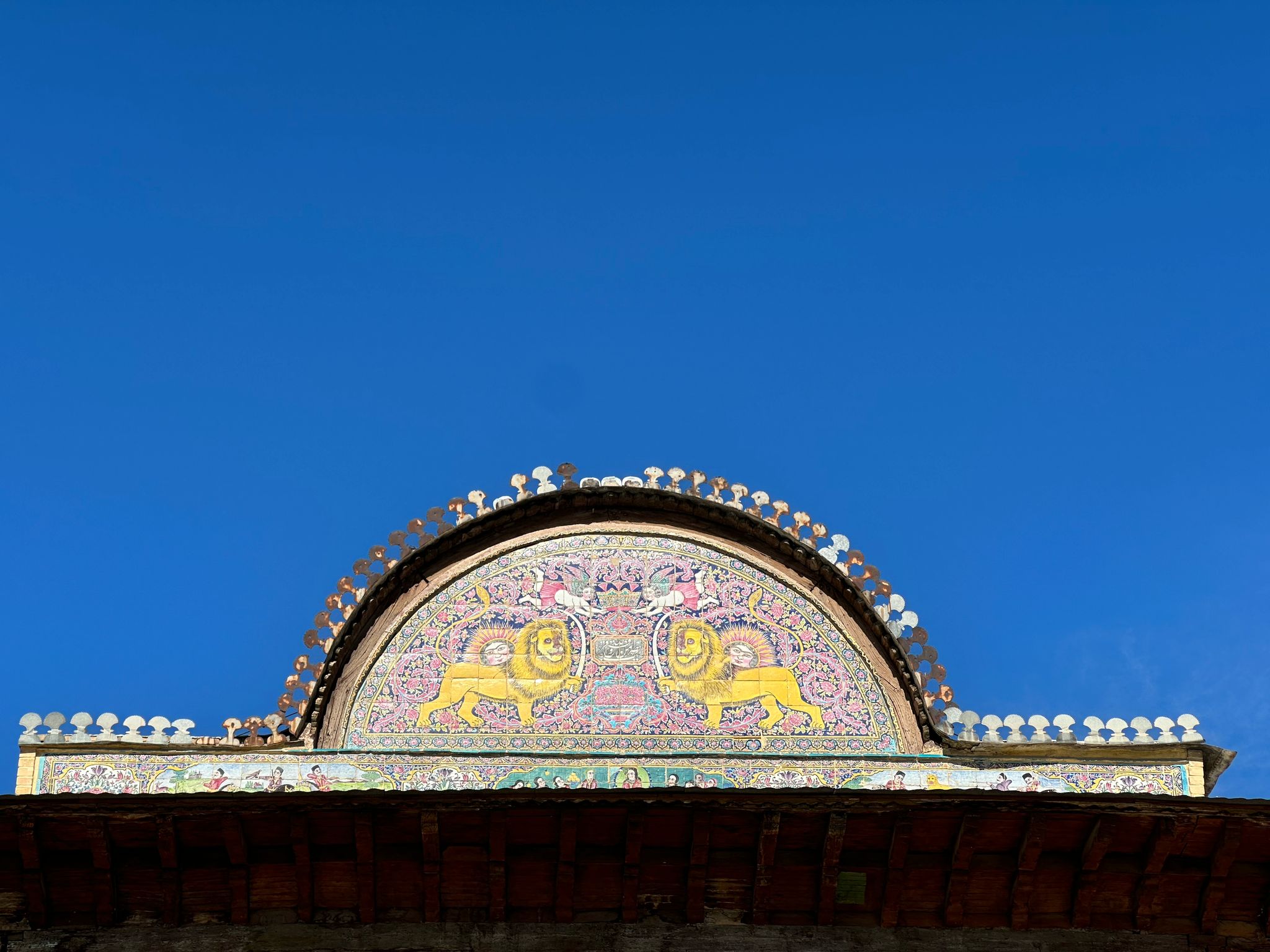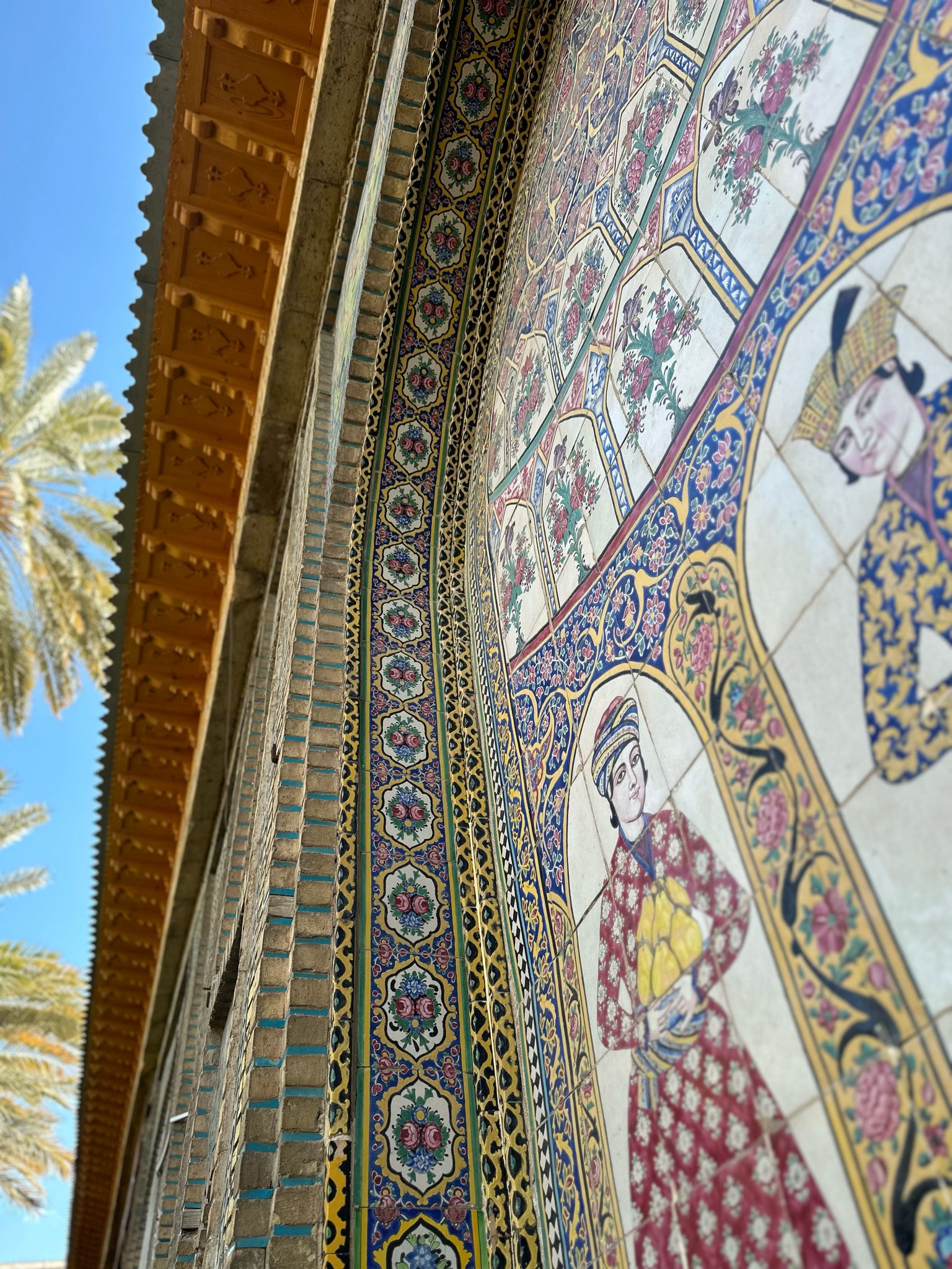 Nasreddin Shah's connection to Bagh-e Eram is evident in the main pavilion's facade tiles. Panels depict Nasreddin Shah on horseback, Solomon's court, women swooning at the beauty of Joseph, and scenes of Khosrow watching Shirin, all rendered in a figurative style.