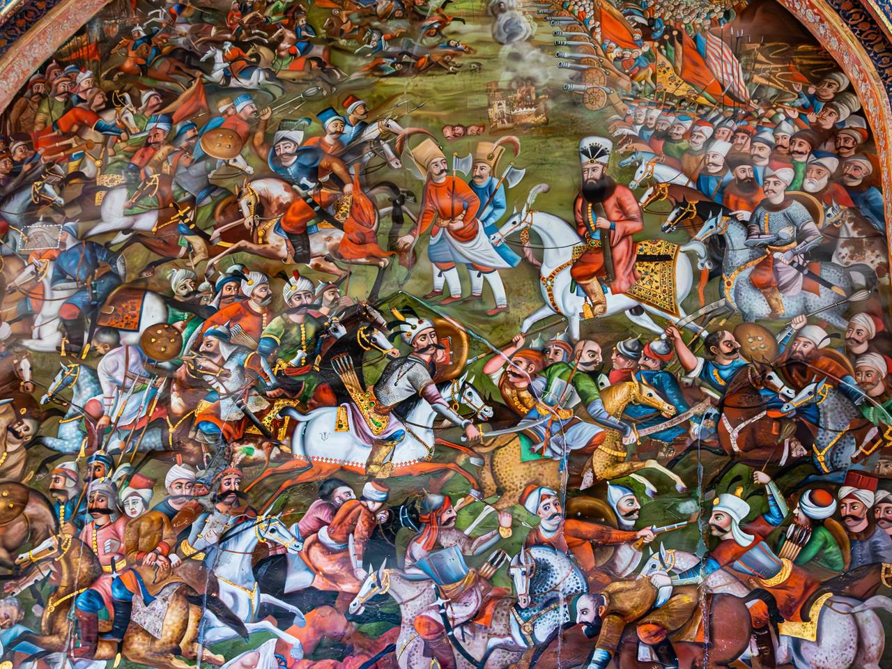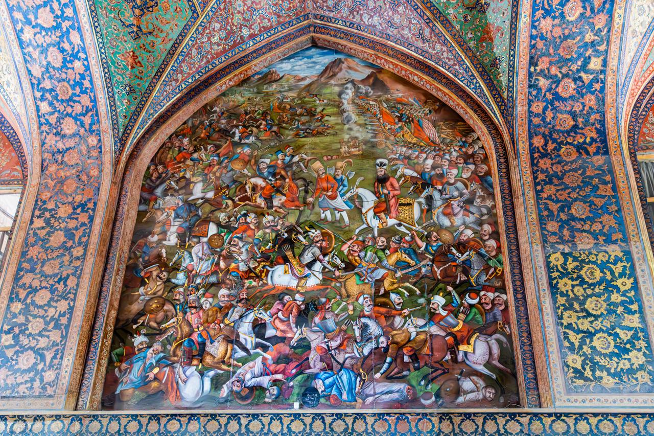 The wall painting entitled Battle of Chaldiran, located on the west wall of the main reception hall of the Chehel Sotoun Palace in Isfahan, is a fresco of the 19th century dating to the Qajar period. This large‑scale scene is one of only a few narrative paintings on the palace’s interior walls that depict historical events. The work attracts attention not only for its traditional Iranian miniature style but also for its use of perspective, volume, and shading techniques in line with the prevailing visual trends of its time.