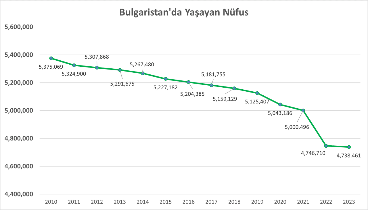 Bulgaristan, 6,5 milyonluk nüfusuyla Avrupa’nın en düşük nüfus yoğunluğuna sahip ülkelerinden biridir. Ülkenin nüfusu 1990’lardan itibaren ciddi bir düşüş yaşamıştır. Bu azalma eğilimi günümüzde de devam etmektedir. 1989’da 9 milyon olan nüfus, doğum oranlarındaki azalma, göçler ve yaşlanma nedeniyle sürekli olarak azalmaktadır.