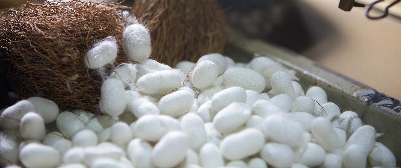Cocoon spinning is completed when the silkworm transitions from the larval stage to the pupal stage inside the cocoon. This stage lasts six to ten days depending on temperature. In silk yarn production this stage is halted before the pupa transforms into a moth through a process called “cocoon boiling”. The cocoons are then dried and the yarn-drawing process begins. The silk spun by the silkworm is in its raw form and cannot be used directly; therefore it must be processed into yarn.