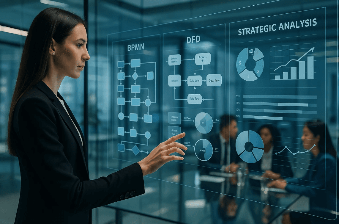 Business analysts analyze existing business processes and develop various improvement proposals to make them more efficient. Processes are often modeled using visual tools. This modeling facilitates better understanding and communication of processes to others. The business analyst recommends eliminating unnecessary steps and proposes measures to reduce waste and costs.