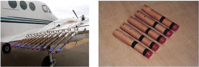 Aircraft-mounted cloud seeding flares and flares containing 50 grams of silver iodide. (MGM)
