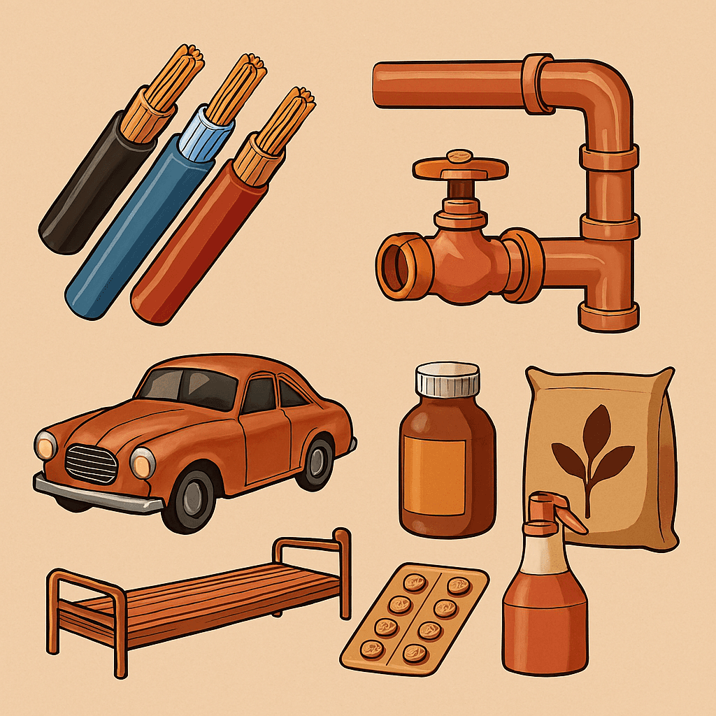 The industrial use of copper is extensive. In the electrical and electronics industry, it is used in cables, circuit components, and motor windings. In construction, it is employed in pipes, roofing materials, and decorative elements. In transportation, it is used in the production of automotive and aerospace parts. In agriculture, it serves as a component in fungicides and pesticides, and in healthcare, it is used in antibacterial surfaces and medical alloys. Additionally, it acts as a primary component in the production of alloys such as brass and bronze.