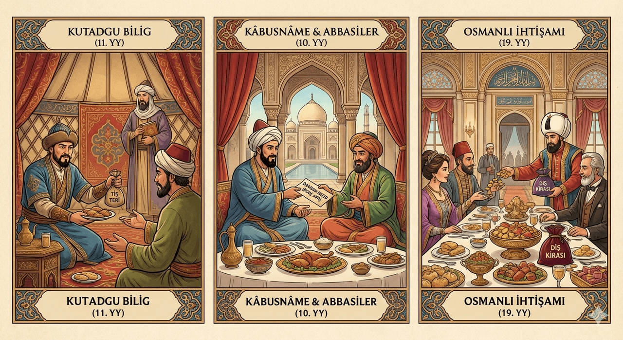 The term Diş Kirası and the practice of mutual aid it represents have deep roots in Turkish cultural and state traditions. The earliest written records of this custom appear in the 11th-century work Kutadgu Bilig, composed by Yusuf Has Hajib and regarded as one of the foundational texts of Turkic-Islamic statecraft. The passage advising, “Give gifts to guests; if possible, give the rent of the teeth (tiş teri),” demonstrates that this practice was integrated into Turkish social structures and state protocol soon after the adoption of Islam. The emphasis on “tiş teri” (teeth’s labor or effort) signifies a symbolic compensation offered in return for the guest’s exertion in accepting the host’s hospitality.