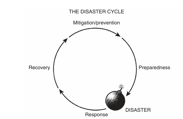 In disasters, the process generally follows a pattern known as the "Disaster Cycle," which consists of the phases: mitigation–prevention, preparedness, response, and recovery. Practitioners of disaster medicine are involved in every stage of this cycle.