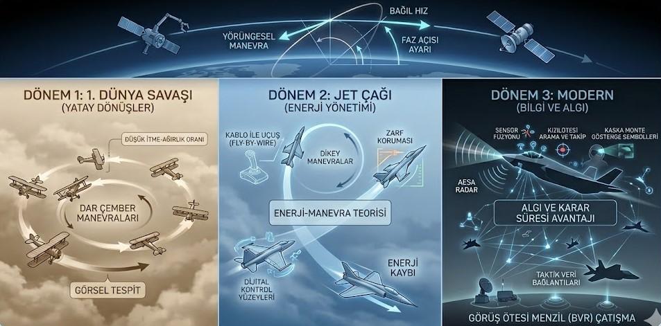 This transformation also demonstrates that dogfight doctrine is not confined to the atmosphere. With the emergence of the possibility of satellite-to-satellite engagements in space—particularly in low Earth orbit—the concept of “space dogfighting” has entered the literature at a theoretical level. In this above-atmosphere scenario, the primary determining factors are not lift generation and aerodynamic drag but orbital phase relationships, apsidal precession, relative velocity differences, and Keplerian dynamics. Pilot commands are replaced by phase synchronization and timing strategies; the classical turn radius relationship <span class="katex"><span class="katex-html" aria-hidden="true"><span class="base"><span class="strut" style="height:0.6833em;"></span><span class="mord mathnormal" style="margin-right:0.00773em;">R</span><span class="mspace" style="margin-right:0.2778em;"></span><span class="mrel">=</span><span class="mspace" style="margin-right:0.2778em;"></span></span><span class="base"><span class="strut" style="height:1.0641em;vertical-align:-0.25em;"></span><span class="mord"><span class="mord mathnormal" style="margin-right:0.22222em;">V</span><span class="msupsub"><span class="vlist-t"><span class="vlist-r"><span class="vlist" style="height:0.8141em;"><span style="top:-3.063em;margin-right:0.05em;"><span class="pstrut" style="height:2.7em;"></span><span class="sizing reset-size6 size3 mtight"><span class="mord mtight">2</span></span></span></span></span></span></span></span><span class="mord">/</span><span class="mord mathnormal" style="margin-right:0.03588em;">g</span></span></span></span> is superseded by relative position and time coordination dictated by orbital mechanics. In this context, space dogfighting can be viewed not as a complete departure from traditional dogfighting but as a natural extension of the “space–angle game” approach: the medium differs, but superiority is still determined by the synthesis of positional and temporal advantage.