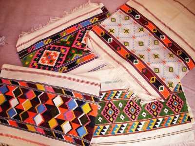 The composition of mahramas consists of symmetrical patterns arranged on the ground fabric. Designs are placed between narrow borders called “su” along the two short edges. Main motifs are arranged either in continuous or spaced rows, while filler motifs typically consist of triangular or cross shapes. The ground is usually cream-colored, and motifs incorporate colors such as navy blue, red, yellow, green, orange, burgundy, blue, pink, purple, gold, and silver thread. Thin lines created by colored weft threads divide the composition into sections, achieving aesthetic unity. Hexagonal motifs are frequently combined with cross motifs, while S-shaped motifs appear either connected or disconnected within the borders.
