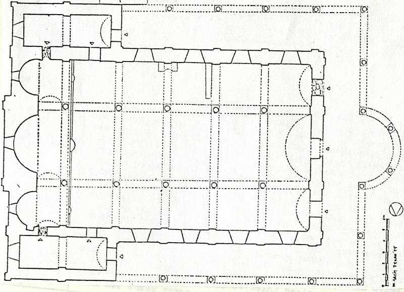 Fertek Kilise Cami is a three-nave basilical structure oriented east-west. The central nave is wider and taller than the side naves and is covered by a barrel vault. Each nave is supported by five columns, which are connected to each other and to the side walls by semi-circular arches.