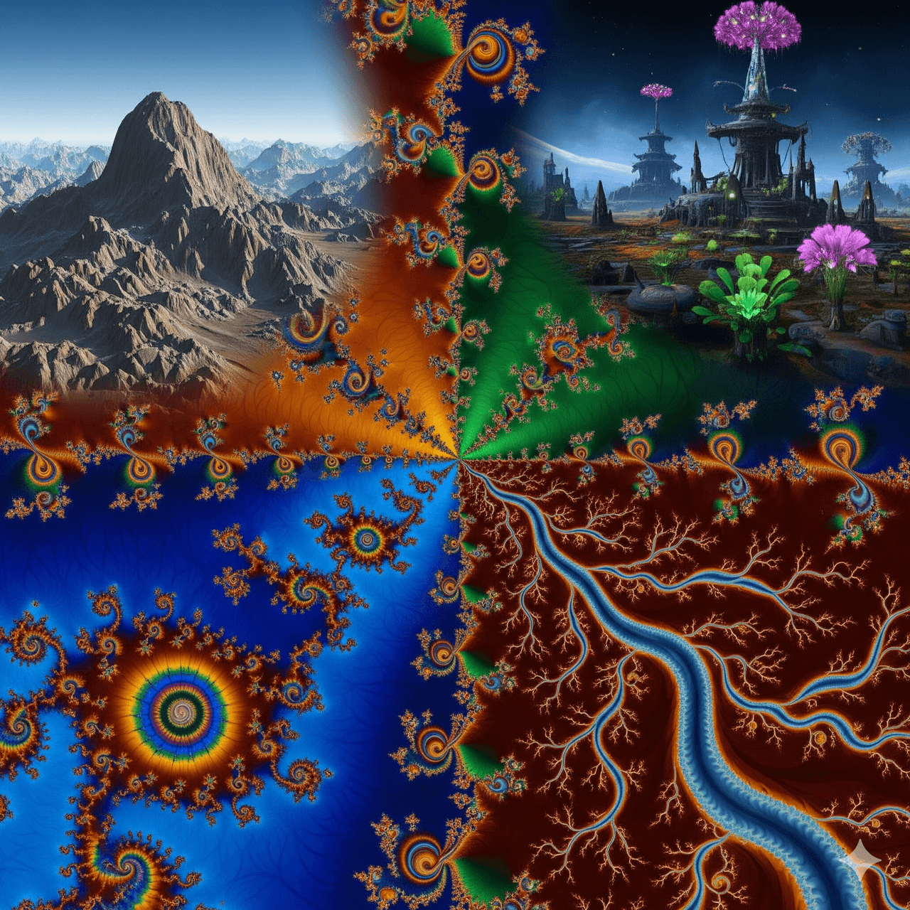 A Visual Representing Different Applications of Fractal Art. (Generated by Artificial Intelligence)