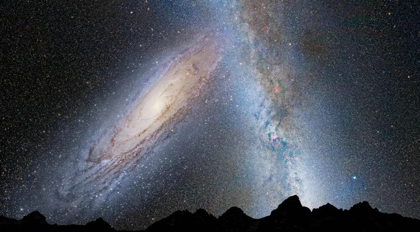 The predicted merger between the Milky Way Galaxy and the Andromeda Galaxy. An image representing Earth's night sky 3.75 billion years from now. (Credit: NASA, ESA, Z. Levay, R. van der Marel) [4]