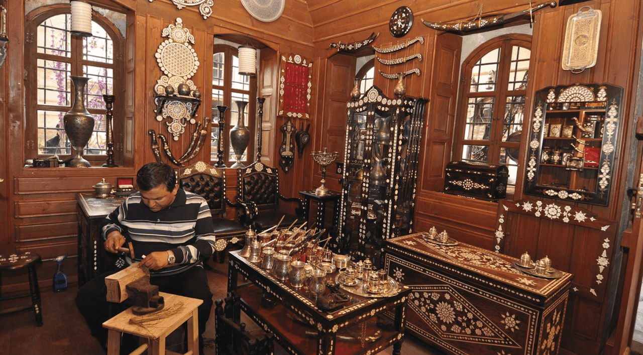 As a Living Museum, Gümrük Han sustains numerous traditional handicrafts unique to Gaziantep. These include silversmithing, coppersmithing, rosary making, mosaic production, glassblowing, mother-of-pearl inlay, wood carving, aba weaving, kutnu and alaca textile weaving, yemeni production, Antep-style embroidery, painterly kilim weaving, and takunya making. Many of these crafts were historically practiced by the local population but have since declined or been reduced to niche tourist markets due to technological advancements and the spread of industrial production.