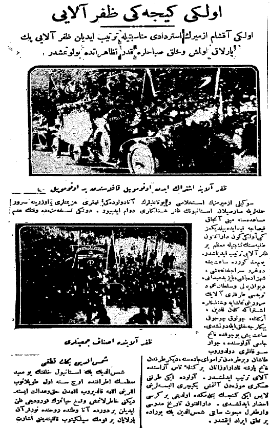 Evvelki akşam İzmir'in İstirdâdı münâsebetiyle tertîb edilen zafer alayı pek parlak olmuş ve halk sabahlara kadar tezâhüratda bulunmuşdur.