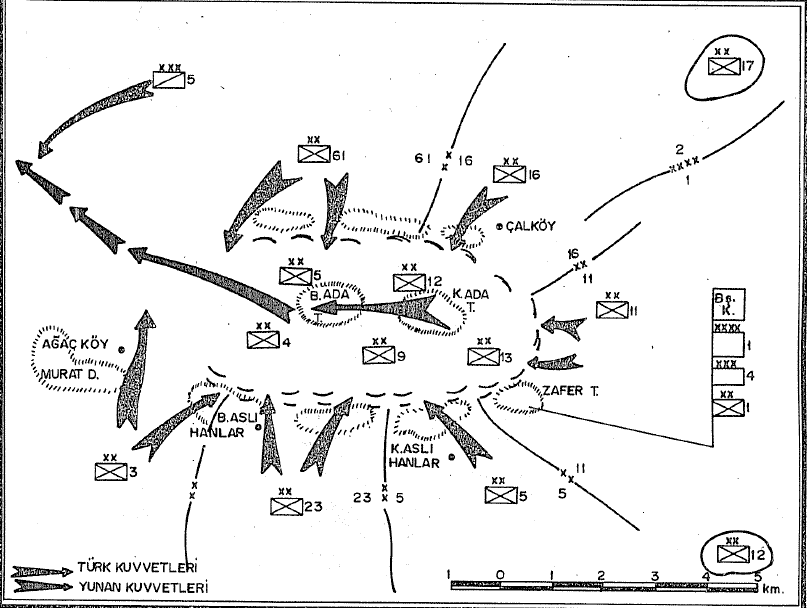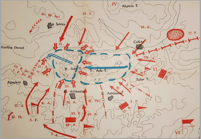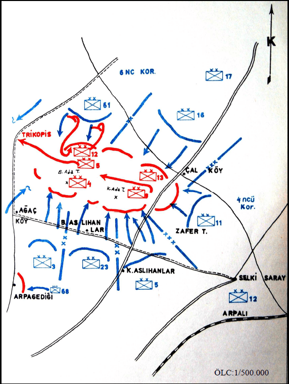 Throughout the night of 29–30 August, the main Greek force concentrated in the Hamurköy–Çalköy–Aslıhanlar triangle attempted to break westward, which was met by the Western Front’s order for “complete encirclement and annihilation.” According to the plan, the First Army would apply pressure from the south, the Second Army from the northeast; while the Fourth Corps units (11th Division from south of Çalköy, 5th Division from northwest of Selkisaray, 23rd Division from north of Aslıhanlar, 3rd Division from Ağaçköy and north) launched the assault, the 16th Division of the Second Army and the 61st Division would attack from Çal and Esinören directions to press the trapped forces into the Adatepe area. The Cavalry Corps was ordered to cut off the escape route westward along the Kızıltaş Deresi–Saraycık–Belova line, aiming to leave no single escape corridor open toward Dumlupınar.
