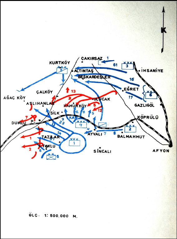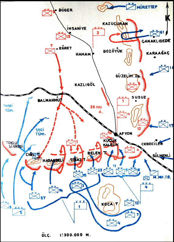 The essence of the operational design was to rapidly achieve a breakthrough and encirclement from the high ground south and southwest of Afyonkarahisar along the Kocatepe–Tınaztepe–Kalecik Sivrisi–Belentepe–Çiğiltepe line, striking the enemy’s flank and rear.【5】 The First Army would form a central weight on this axis; brief but intense artillery fire on fortified ridges would open breakthroughs; infantry assaults would rapidly penetrate depth through close-range night marches.