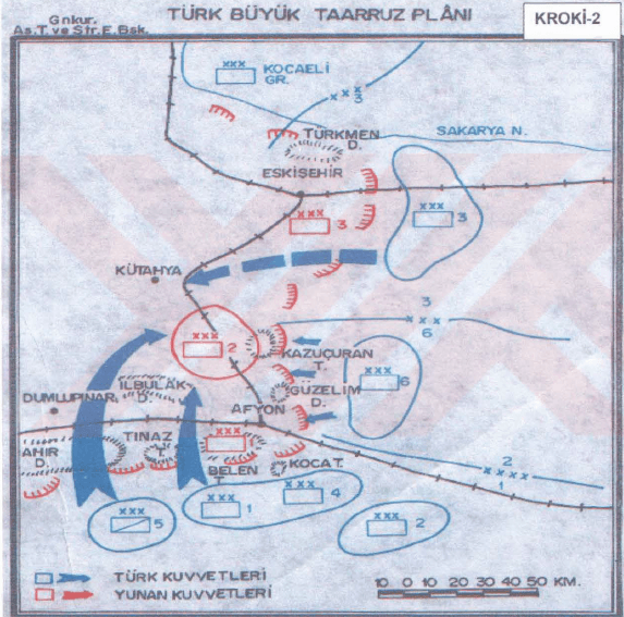 Simultaneously, the Second Army would maintain pressure on other sectors to prevent Greek reserves from being redeployed; the Cavalry Corps would immediately launch raids on railway stations, telegraph lines, and junctions to render the rear area inoperable. Coordination among these three action arms would be provided from the command position (Kocatepe) from the first hours of the offensive; short preparatory fires in a “strike-and-withdraw” pattern would tightly link infantry and cavalry movements.