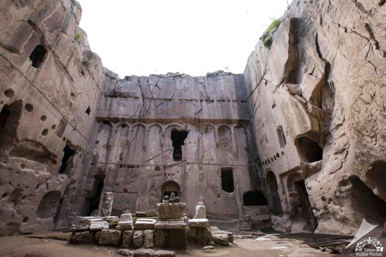 According to the general classification of rock-cut monasteries in Cappadocia, Gümüşler Monastery belongs to the open courtyard group. The church located in the northern part of the complex constitutes its most important section. The church has a closed Greek cross plan supported by four free-standing pillars. Two burial niches are situated to the north of the northern arm of the cross, while two entrance spaces with barrel-vaulted ceilings lie to the west of the naos. Although rooms, galleries, and various other spaces surround the courtyard, the exact function of all these areas has not been definitively determined.