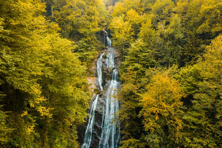 Below the waterfall are Lake Efteni and Bird Paradise; above it is Pürenli Plateau. The surroundings of the waterfall are covered with dense forest, and its natural landscape value is high.