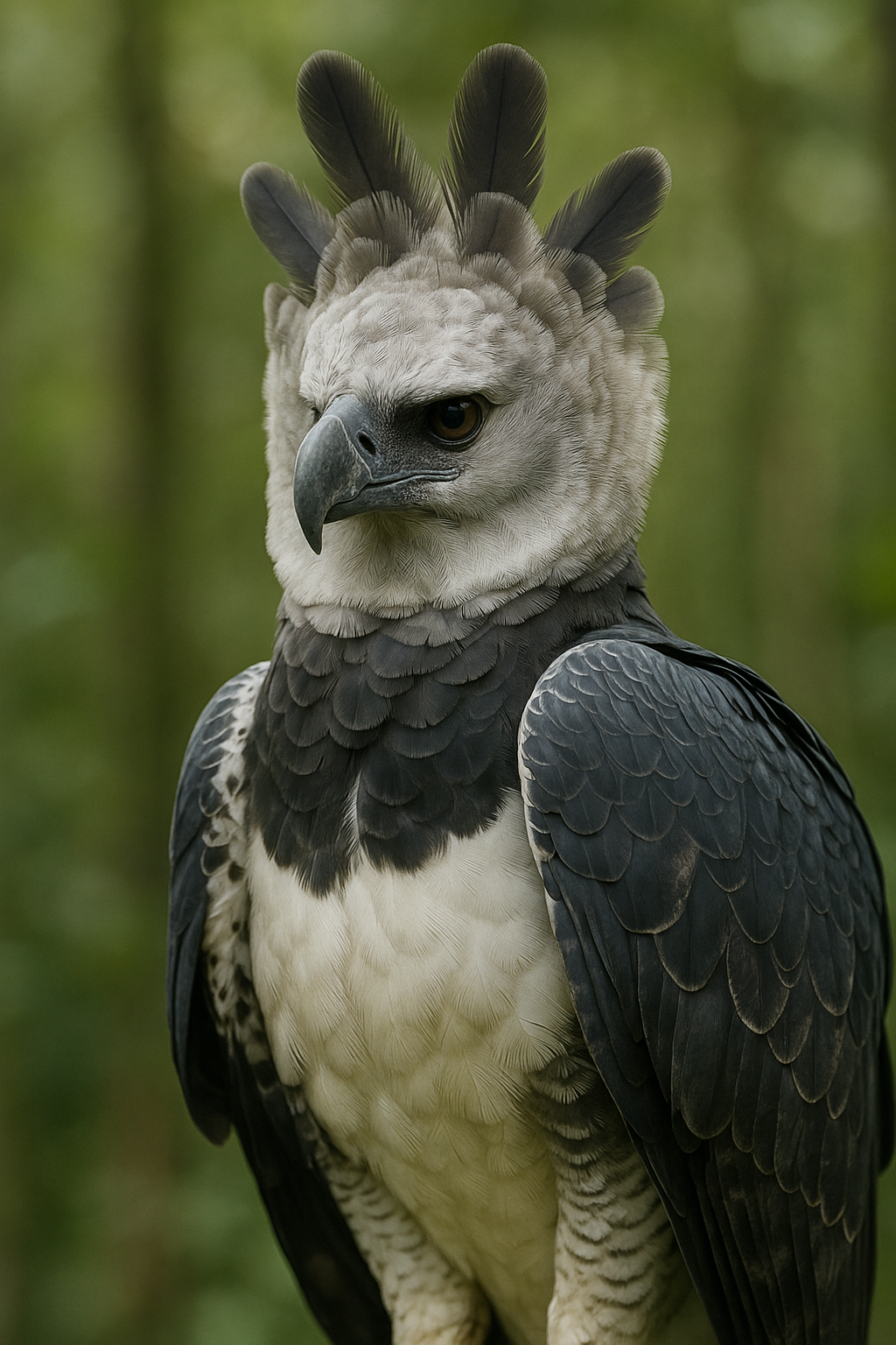 The harpy eagle stands out with its powerful and robust build. Its average wingspan can reach up to 2 meters, while body length varies between approximately 90 and 105 cm. Females are generally larger than males, with weights ranging between 6 and 10 kg. One of the most striking features of the species is the pair of feathered crests located on its head. These crests may serve functions in visual communication and during hunting. The eyes are positioned forward, enabling stereoscopic vision and precise depth perception. Its talons are large and curved, designed to grasp prey with ease. The toes are thick and strong, a structure that allows the eagle to effectively hunt large mammals. Compared to other large eagles, its tail is short, and wings are relatively shorter and broader, enhancing maneuverability within dense forest environments.