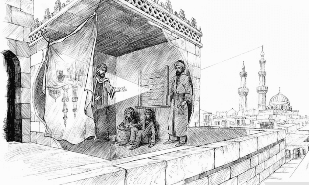 Ibn al-Haytham observed that during a solar eclipse, light entering a room through a small hole in a window projected a crescent-shaped image on the wall, thereby demonstrating experimentally that light travels in straight lines. He referred to this device as “bayt al-muzlim” (Arabic: dark room). The concept was later translated into Latin as camera obscura and formed the theoretical foundation of photographic technology.