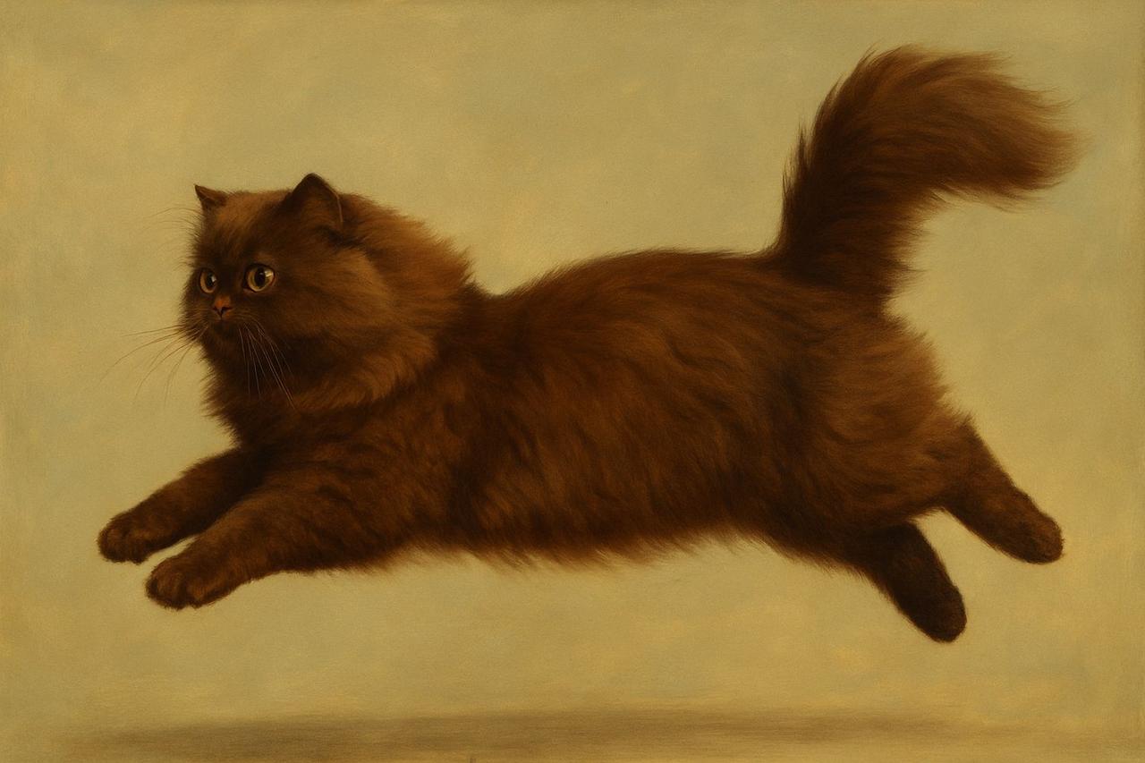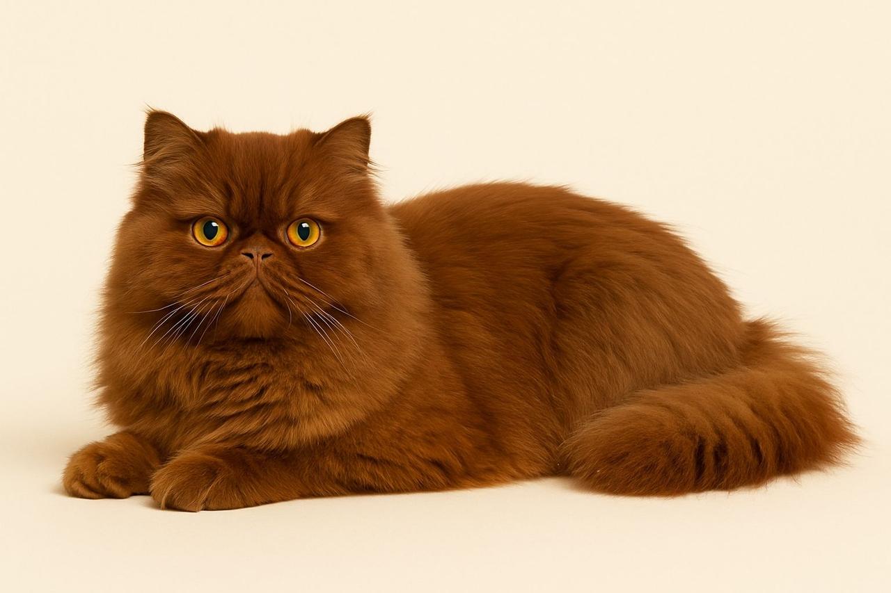 The Persian cat’s coat is long and dense. A ruff resembling a mane may form around the neck, and body fur in some individuals may reach near-floor length. The tail fur appears fluffy. The coat consists of a double layer: a thick undercoat and long, soft guard hairs. Persian cats exhibit a variety of coat patterns, including solid (white, black, cream, blue, etc.), bicolor, tricolor (calico), smoke, shaded, and the Himalayan point pattern. In Himalayan-patterned individuals, the body is light-colored while the extremities are dark, and the eyes are blue. Persian cats typically have amber or dark orange eye color; blue eyes or heterochromia may occur in white-coated individuals. Himalayan-type individuals always have blue eyes due to genetics.