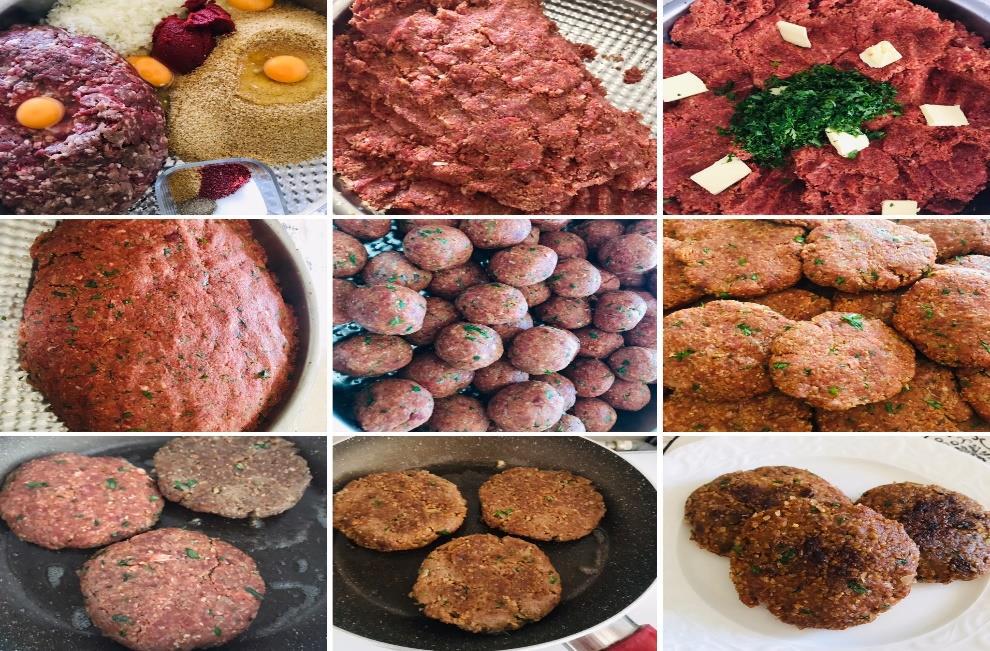 In the preparation stage, onion and fine bulgur are kneaded together until the bulgur softens. Then, ground beef and the remaining ingredients are added, and the kneading continues. Parsley may be added optionally. Small portions of the mixture are shaped by hand into flat, round patties approximately 6–8 cm in diameter and 1.5 cm thick. These patties are traditionally cooked on a griddle (sac) or in a pan, using olive oil over medium heat, and are pan-fried on both sides. The cooking time is typically 6 to 8 minutes.