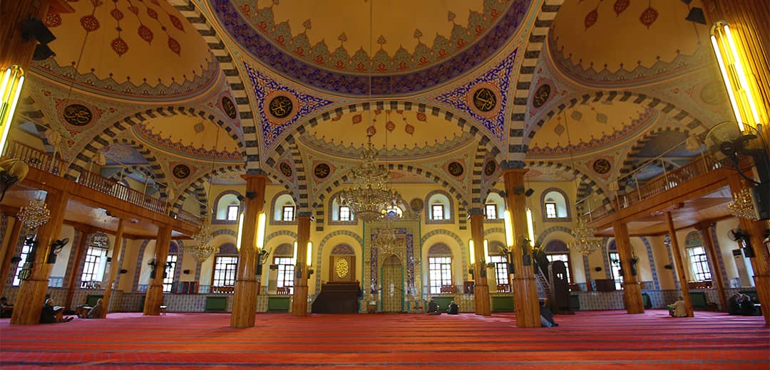 On the north façade, there is a second-floor gallery with a "U"-shaped plan, featuring an elliptical projection at the center. Inside the mosque, galleries extend along the north, east, and west façades. The section of the interior walls up to the window level is covered with tiles, while the upper parts are plastered. The transition elements of the dome and the window arches are adorned with pencil work decorations and calligraphic inscriptions. These decorations feature the names of "Allah" and "Muhammad," as well as the Four Caliphs (Çihâr Yâr-ı Güzîn) and the names of the Ten Companions Promised Paradise (Aşere-i Mübeşşere) in Celî Sülüs script. On the central dome, there is a band of inscriptions from the Esmaü’l-Hüsna (the Ninety-Nine Names of Allah). These inscriptions and decorations were renewed during the restoration in 1998 by Hüseyin Öksüz and Sinan Hidayetoğlu.