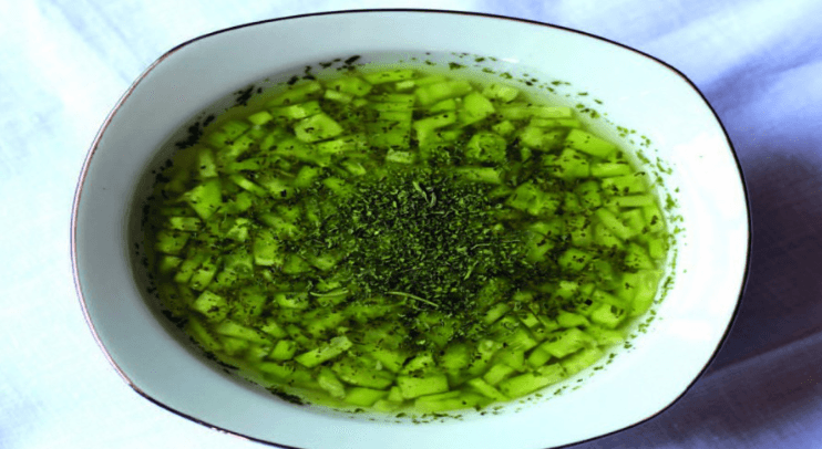 The koruk are washed and crushed to extract their juice. The cucumbers are peeled and finely chopped. The garlic cloves are peeled and crushed. The chopped cucumber and crushed garlic are placed in a serving bowl. The koruk juice is added, salt is incorporated and the mixture is stirred. The salad is divided into small bowls and sprinkled with dried mint. It is recommended to serve with ice during the summer months. In off-season periods, bottled koruk juice is used.