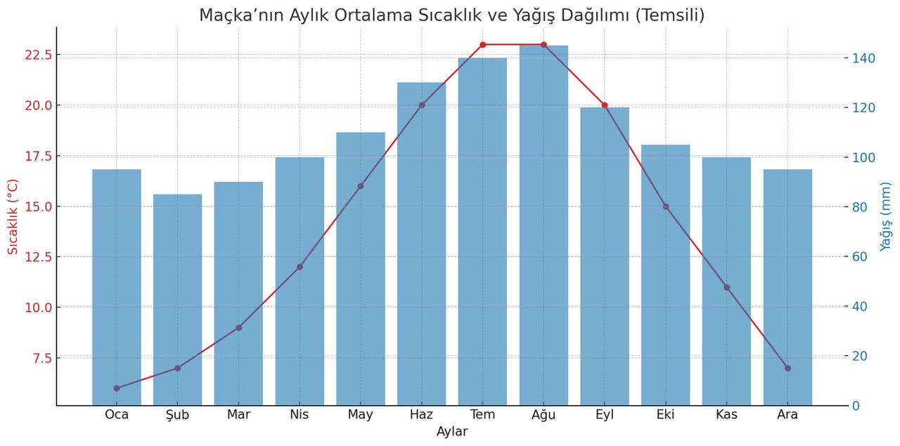 The graph shows representative monthly average temperature and precipitation values for Maçka. A humid and mild climate prevails throughout the year. Temperatures rise during summer months, while precipitation remains high. This climate is the primary reason for the district’s rich forest cover and plant diversity.