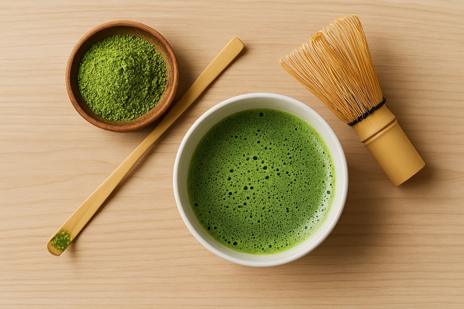 Traditional Preparation Method: One teaspoon of matcha is whisked with approximately 60–70 ml of hot (but not boiling) water using a bamboo whisk (chasen).