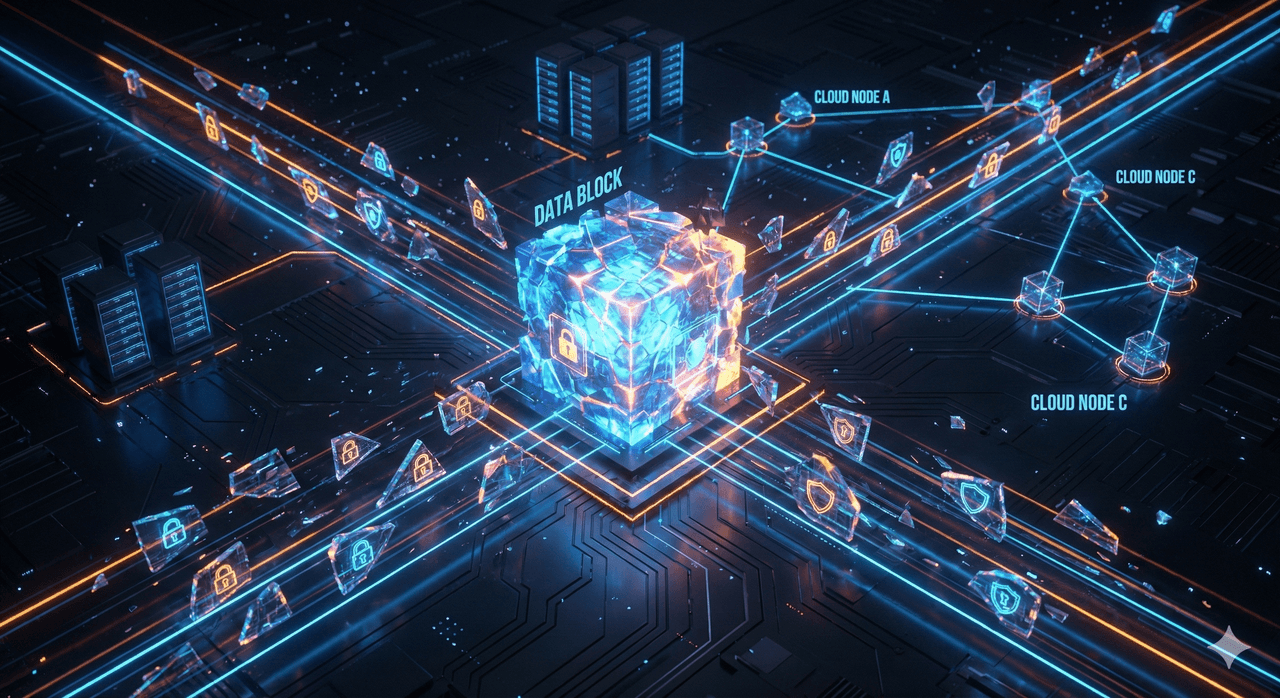 Secure distribution of data fragmented using cryptographic methods across multiple cloud providers. (Generated by Artificial Intelligence.)
