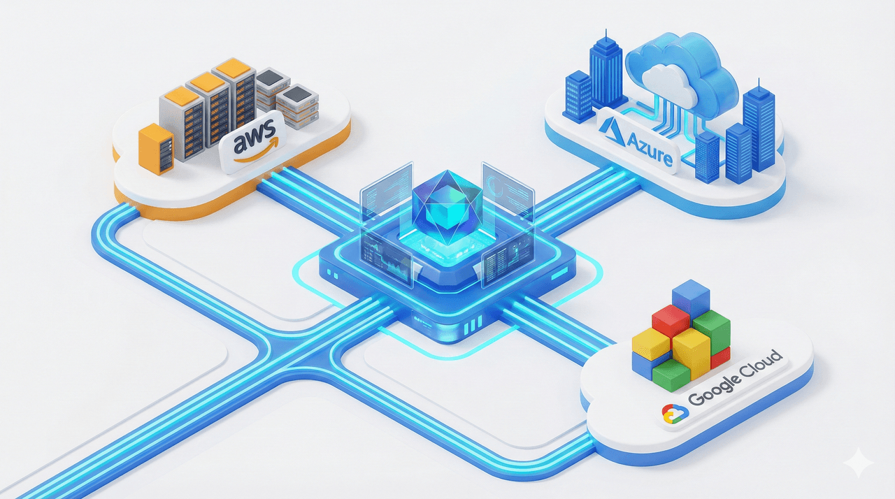 Multi-cloud architecture integrating cloud providers (AWS, Azure, Google Cloud) within a single management plane. (Generated by Artificial Intelligence.)