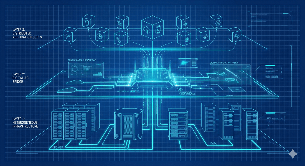 Layered technical schematic of a multi-cloud architecture comprising heterogeneous infrastructure, digital API bridges, and distributed application components. (Generated by Artificial Intelligence.)