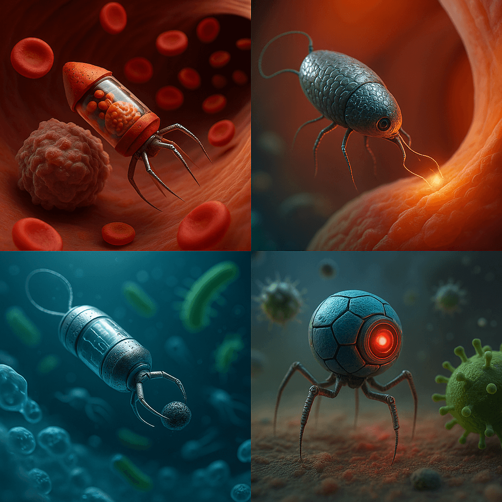 Visual representation of nanobot applications in medical, environmental, industrial, and defense fields (designed with artificial intelligence).