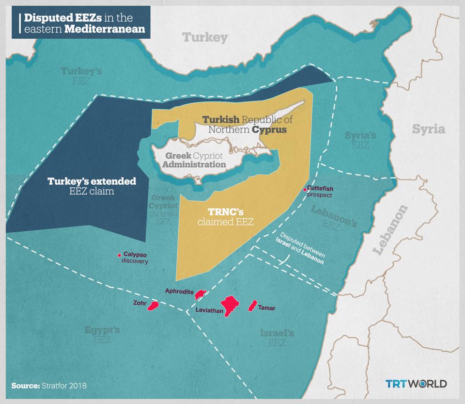 Disputed Economic Exclusive Zones (EEZ) in East Mediterranian (Source: Stratfor/ TRT World)