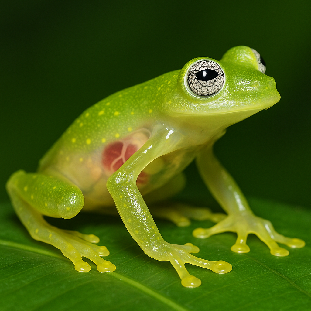 Northern Glass Frog (Hyalinobatrachium fleischmanni) is a small amphibian belonging to the Centrolenidae family, particularly known for the semi-transparency of its ventral region. This characteristic allows its internal organs, such as the heart, liver, and digestive system to be observed externally. This morphological adaptation has made it a valuable model organism for scientific studies and has positioned the species as visually distinct. Often referred to as "glass frog" in English literature, this species exhibits striking physiological and behavioral characteristics among amphibians.
