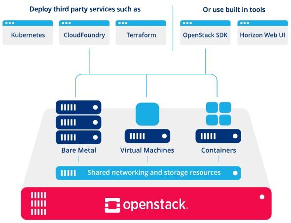 This diagram highlights OpenStack’s flexible and extensible architecture, demonstrating its ability to support diverse environments—bare metal, virtual machines, and containers—as well as its integration capabilities with third-party services.