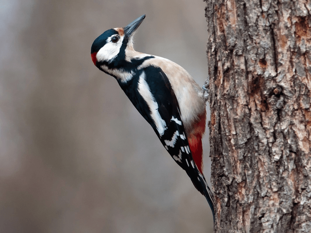 The great spotted woodpecker inhabits a wide geographic range extending from boreal taigas to Mediterranean climates, living in various forested areas, shrublands, fruit gardens, parks, and large estates. This species is widespread in the northern part of the Palearctic region【1】