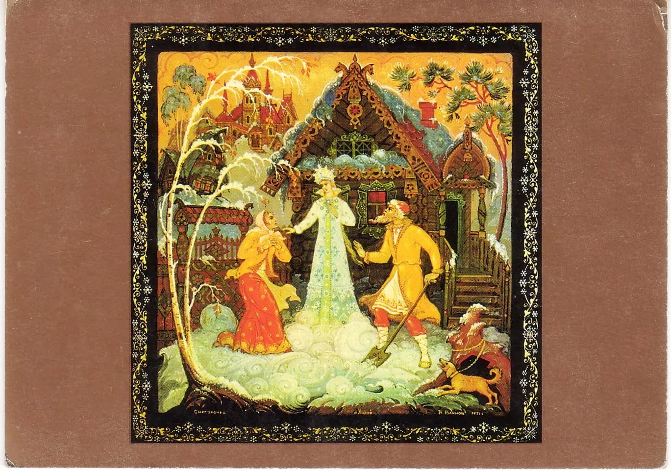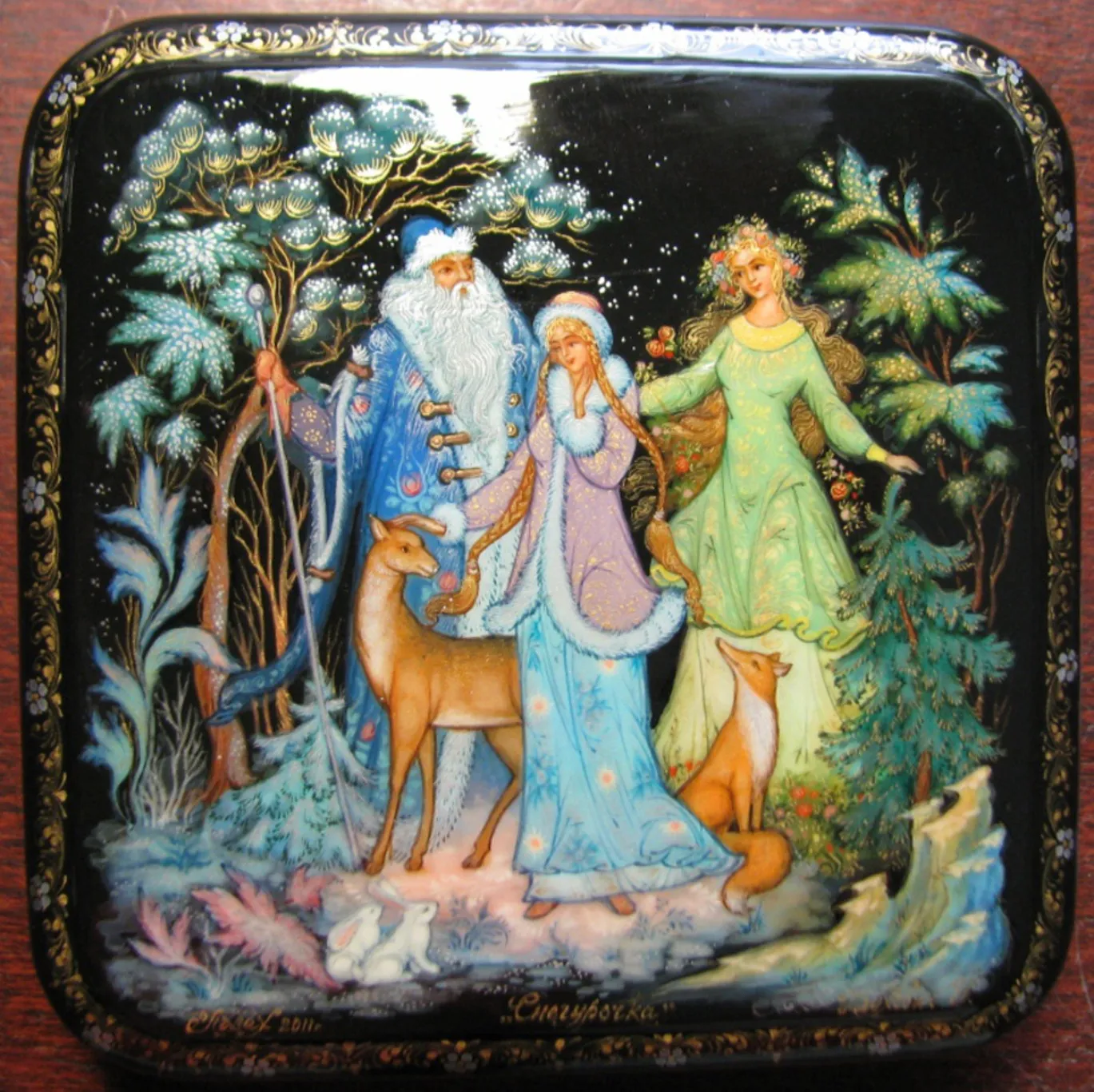 One of the distinctive features of Palekh miniatures is the use of gold embellishments. Artists use gold leaf or gold pigments to accentuate details. A special technique called “zlachenie” is used to add golden lines, imparting brightness and a luminous effect to the scene. Additionally, a method known as lazurnik, or laser technique, is employed to add transparent layers of paint that enhance the depth of the figures.