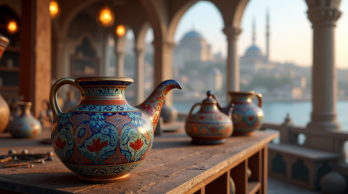 During the Ottoman period, pottery reached an even higher level, with significant advancements in centers such as İznik, Kütahya, and Çanakkale. From the 15th century onward, ceramics produced in İznik gained recognition for their high-quality white clay and glossy glazed surfaces. Ottoman ceramics and tiles were typically adorned with red, blue, green, and turquoise hues, featuring floral, foliage, and Hatayi designs. By the 16th century, Ottoman ceramic art had reached its peak, with tiles from this period decorating monumental structures such as Topkapı Palace and Süleymaniye Mosque.