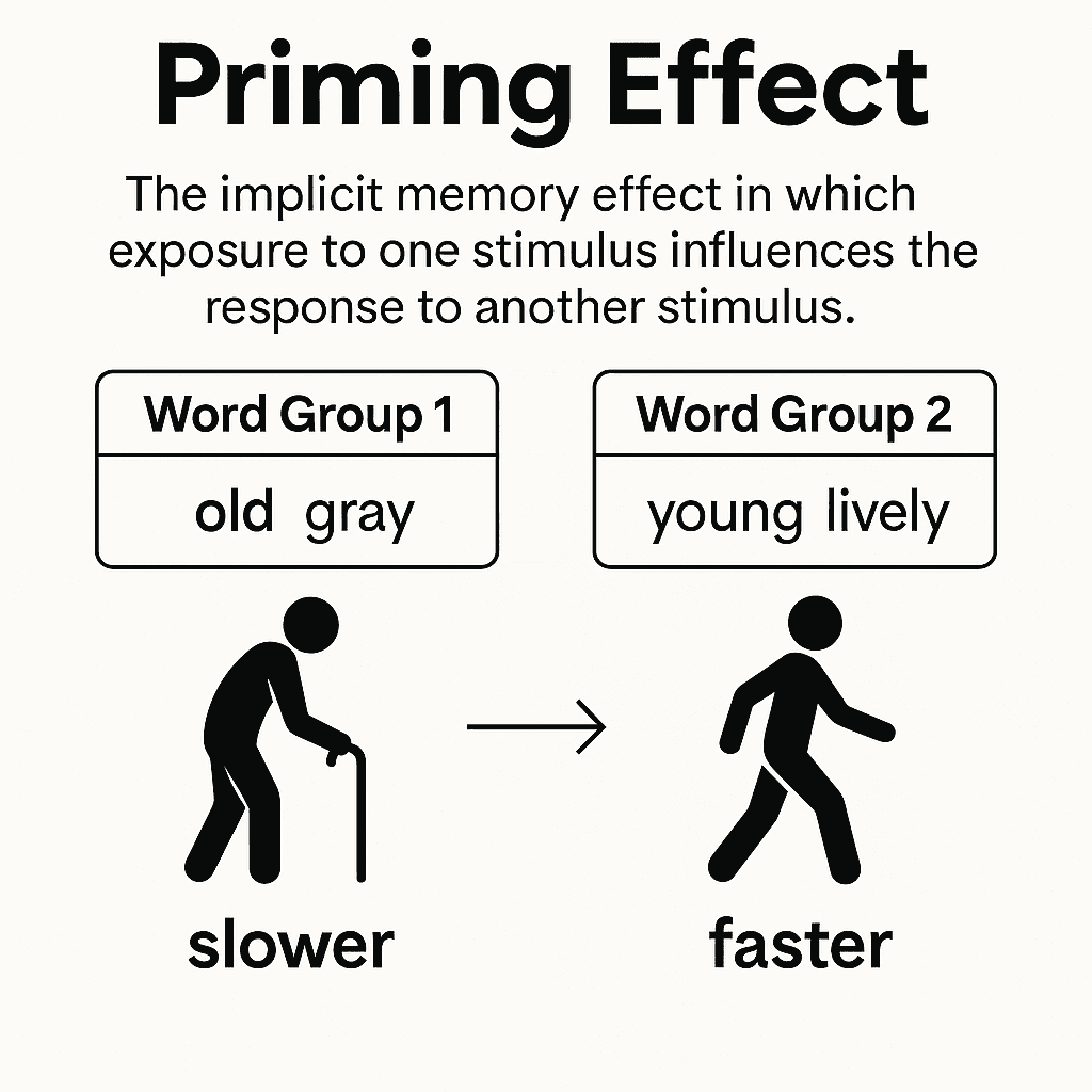 Priming occurs when a prior experience-related stimulus facilitates or alters subsequent information processing. Such stimuli can shape perception, decision-making, and responses. Priming typically operates at an unconscious level.