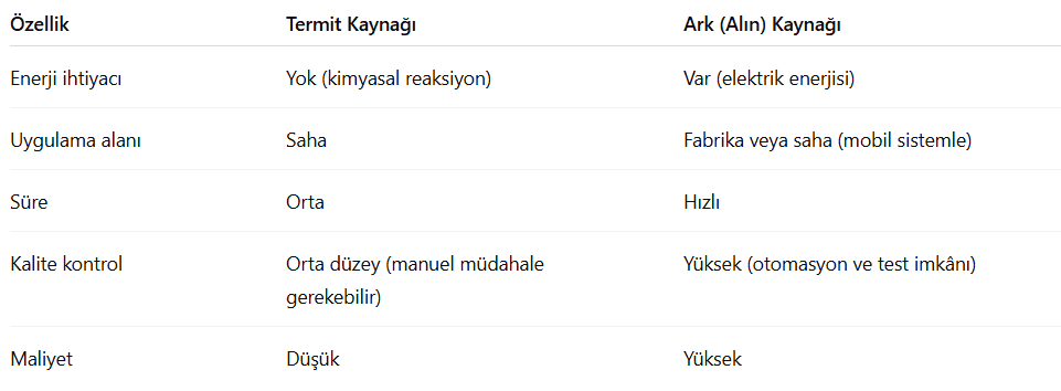 In particular, when applied in factory assembly or using mobile flash butt welding machines, arc welding outperforms other methods in both efficiency and quality. Due to its more controlled and testable results compared to thermite welding, it is widely preferred in new high-speed rail projects. In Türkiye, flash butt welding technologies are employed within TCDD, and these applications are supported through dedicated personnel training programs.