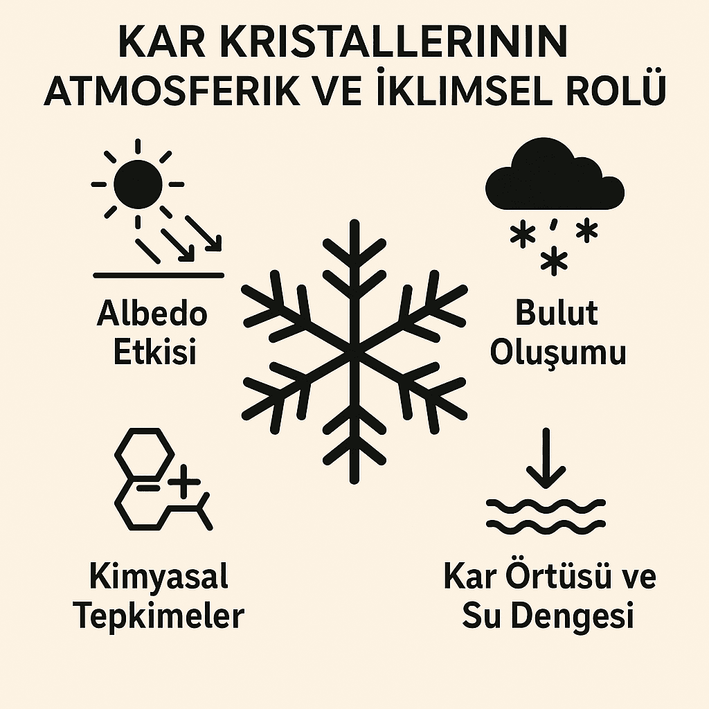 Snow crystals are not merely an aesthetic natural wonder; they are also a vital component of the complex puzzle of atmospheric and climatic dynamics. Snow crystals directly affect the Earth’s energy balance. As they fall to the surface, they create an albedo effect by reflecting sunlight, thereby reducing surface warming. Especially in polar regions and high latitudes, the presence of snow cover ensures that a significant portion of incoming solar energy is reflected back into space. This has a cooling effect on regional and global climates.